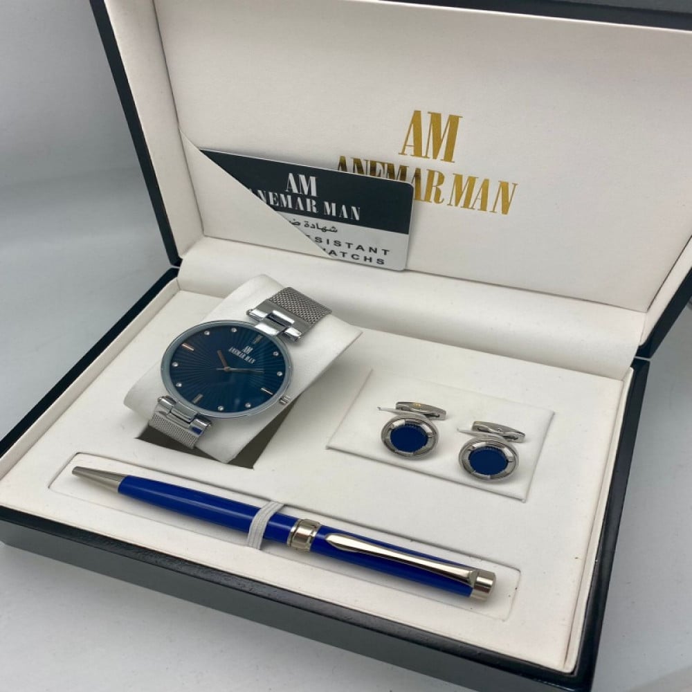 استعد للتميز مع طقم رجالي فاخر يضم ساعة أنيقة، وكبك مميز، وقلم راقٍ، مقدم في علبة فاخرة تناسب أرقى الأذواق