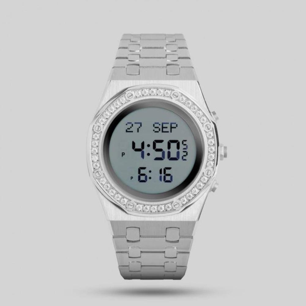 ساعة الفجر الحديث نسائية مصنوعة من الستانلس ستيل مرصعة بالزركون باللون الفضي وشاشة بيضاء مميزات المنتج: شكل دائري. إطار ستانلس ستيل. شاشة بلورية. مقاومة للماء. منبه لكل صلاة. أوقات الأذان لجميع مدن العالم. تاريخ هجري وميلادي. تحديد اتجاه القبلة. تحتوي على اللغتين العربية و الانجليزية. خاصية متابعة قراءة القران الكريم. خمس تقاويم مختلفة لحساب الأذان. منبه يومي للمواعيد الثابتة.